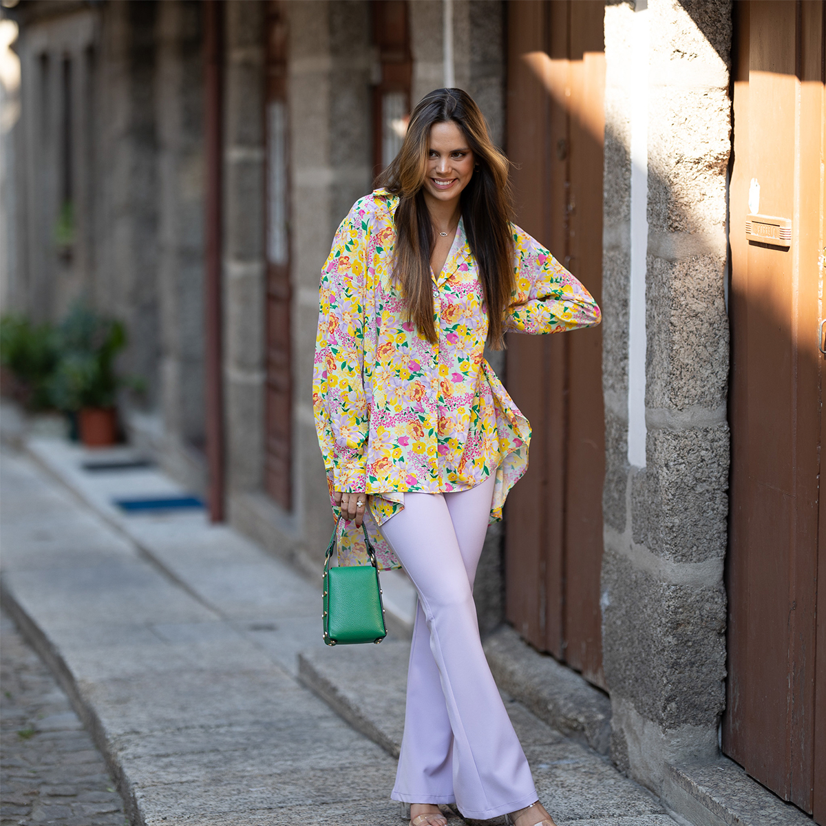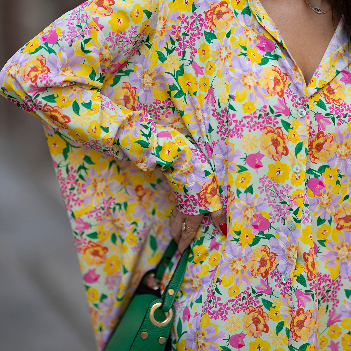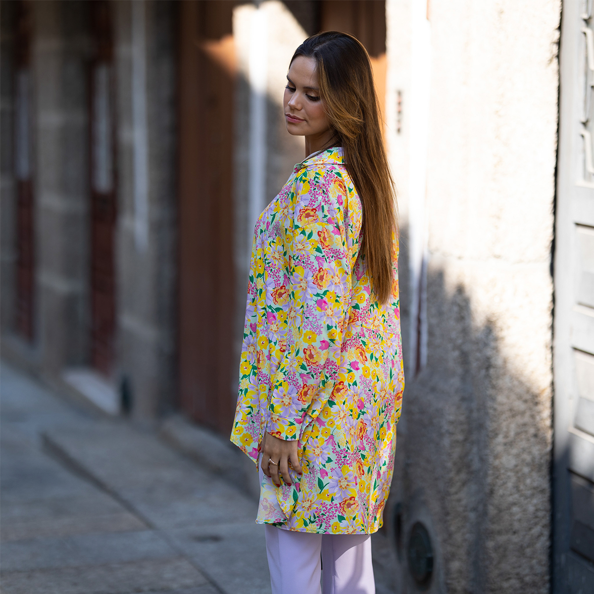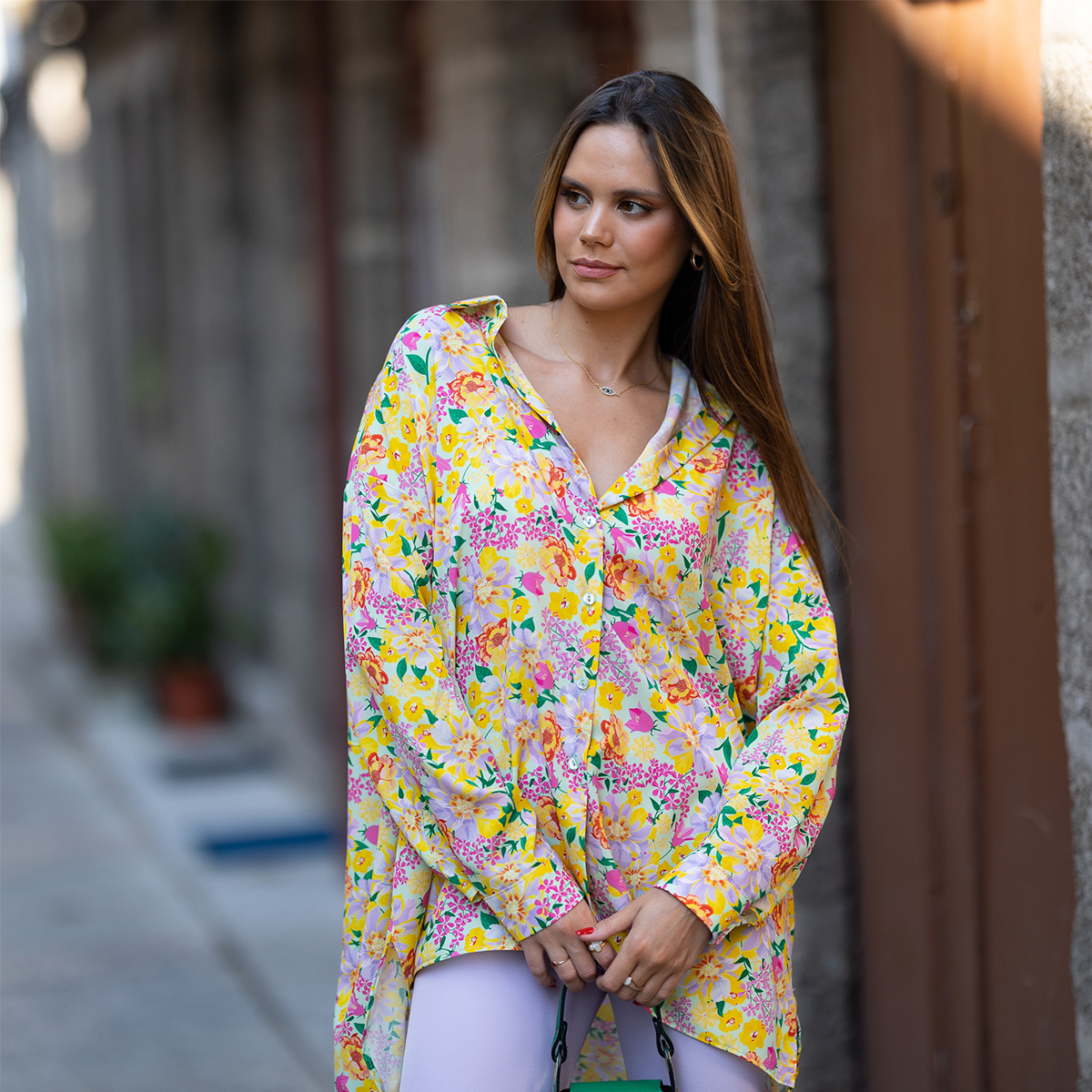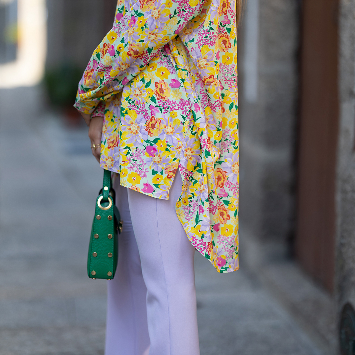 Camisa de manga comprida oversize verde com padrão floral e botões verdes.
