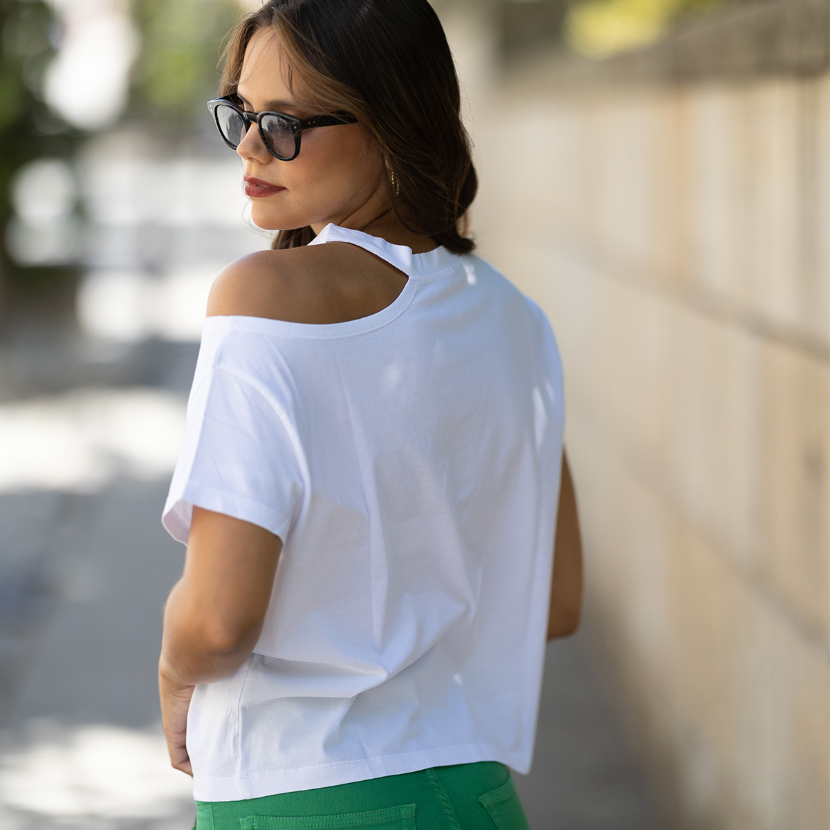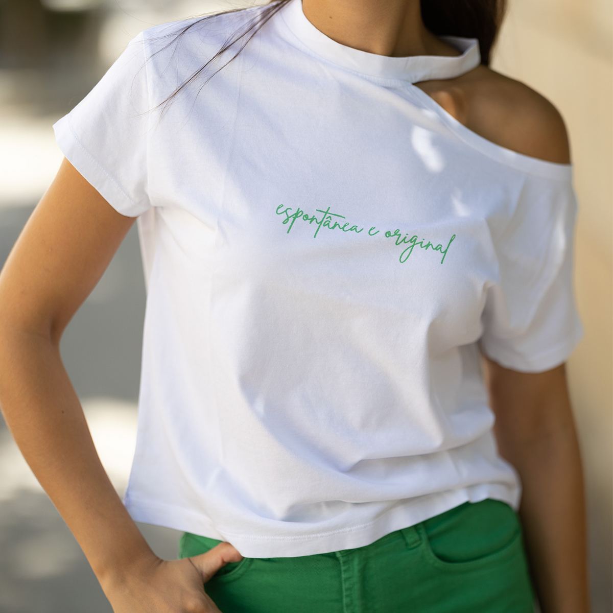 Detalhes: decote ombro/ manga curta/ algodão/ mensagem